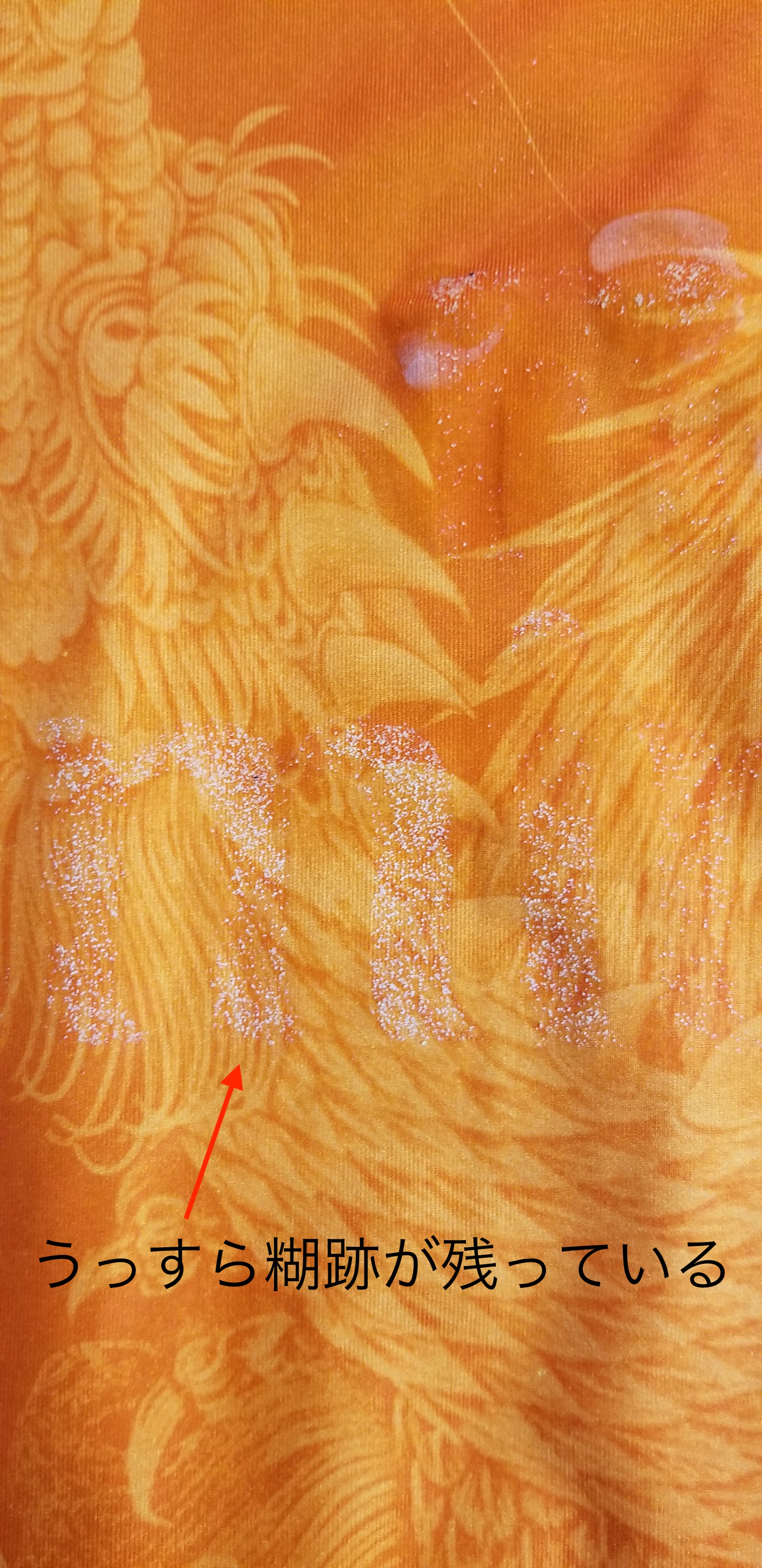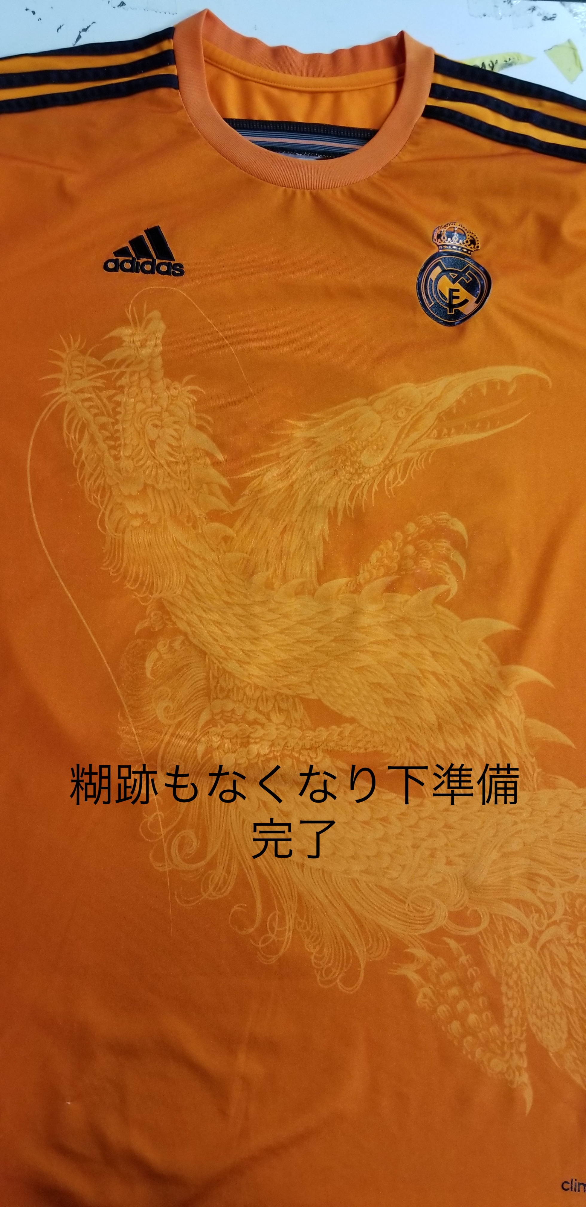 今回はレプリカユニフォームの貼替え依頼です。文字が1つ完全に剥げており(エミレーツのE)その他の文字も端の方からめくれていましたので、文字を全部取り再度同じ場所に貼り付ける作業です。特殊な剥離液で文字を取っていきます。除去できていない糊の跡を違う種類の剥離液を使い落としていきます。簡単に落ちる場合とそうでない時がありいつもこの作業は緊張します。今回は比較的簡単に落ちました。ウェアはまだまだ使えるのでこれを着てサッカー楽しんでくださいね。